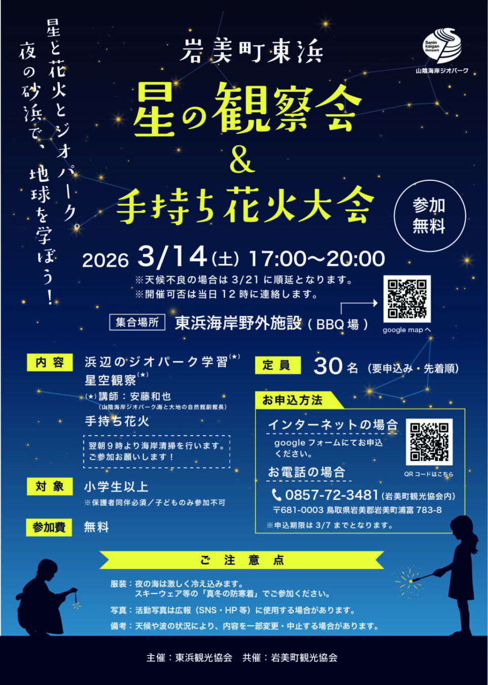岩美の冬から春への移り変わりを共に体感する、特別な一夜。 当日は、安藤和也先生(山陰海岸ジオパーク海と大地の自然館副館長)による深い学び、そして澄み渡る星空と冬の花火を、皆さまとご一緒できることをスタッフ一同、心より楽しみにしております!